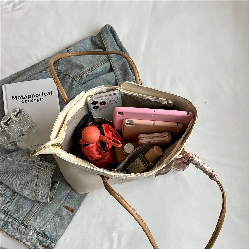 The scarf detailing is a nod to classic fashion trends, adding a touch of retro elegance to the modern design of the Zenith Tote.